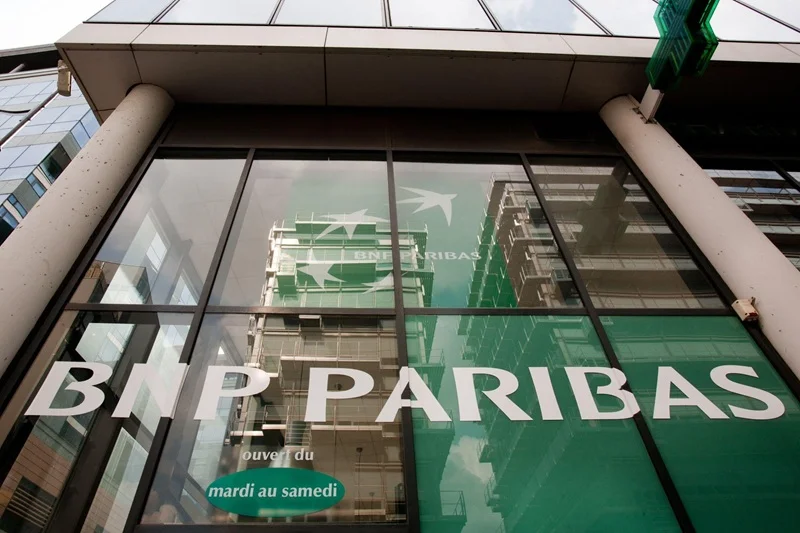 Fachada do BNP Paribas associada à emissão de fundo monetário em blockchain pública Ethereum