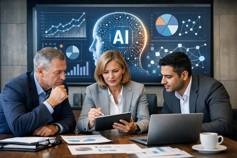 Executivos analisam dados com apoio de inteligência artificial em ambiente empresarial